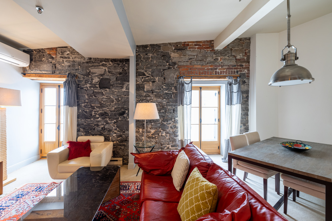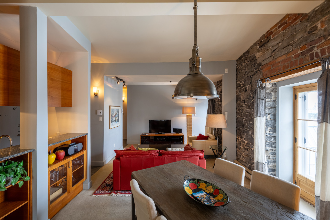 Vaste aire ouverte donnant accès au salon, salle à manger et cuisine laboratoire. Un espace avec table de travail y est aussi aménagé.