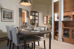 Aire ouverte avec cuisine bien équipée, comptoir lunch, coin repas et salon doté d'un sofa et d'un fauteuil, téléviseur à écran plat 60";